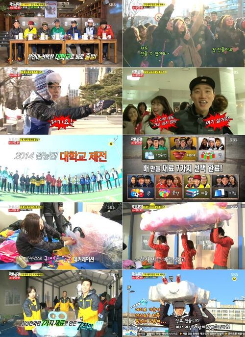 '런닝맨' 멤버와 대학생 2인으로 구성된 각 대학교 팀들은 제작진이 준비한 게임을 통해 순서대로 배를 만들 재료를 선택했다. 이 과정에서 지석진은 생수병, 하하는 대야, 유재석은 캔, 김종국은 공, 이광수는 풍선, 송지효는 이불, 개리는 비닐 등 기상천외한 일곱가지 재료를 선택해 이색 배 만들기에 착수했다.