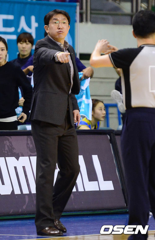 2일 오후 춘천호반체육관에서 열린 '우리은행 2013-2014 여자프로농구' 춘천 우리은행과 안산 신한은행의 경기 2쿼터 신한은행 임달식 감독이 심판에게 항의를 하고 있다.