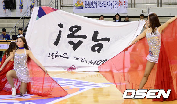 2일 오후 춘천호반체육관에서 열린 '우리은행 2013-2014 여자프로농구' 춘천 우리은행과 안산 신한은행의 경기, 치어리더들이 공연을 펼치는 가운데, 우승을 기원하는 현수막이 거꾸로 펼쳐지고 있다.