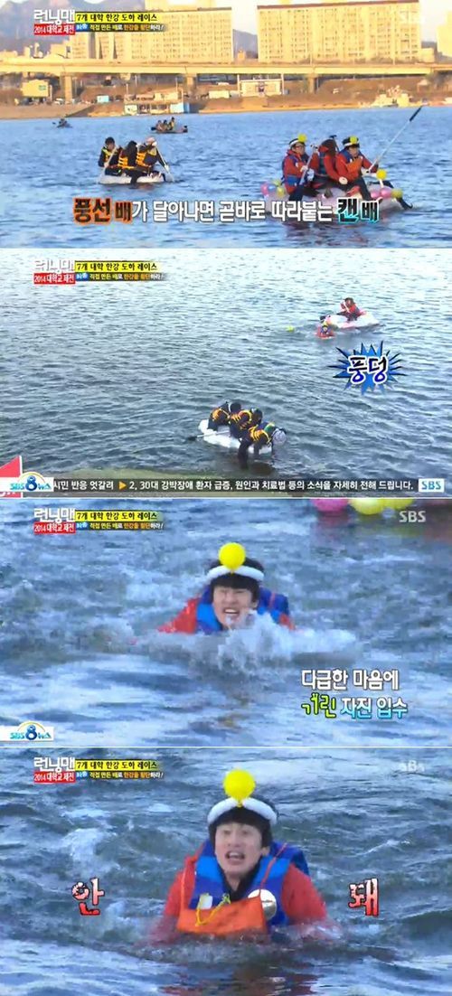 배우 이광수가 유재석 팀과의 경쟁에서 이기기 위해 한강 도하 도중에 자진 입수해 웃음을 자아냈다.