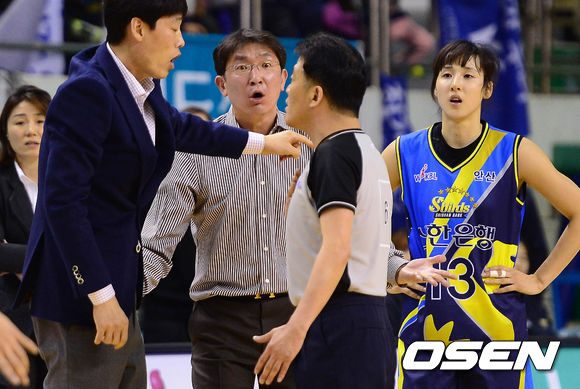 2일 오후 춘천호반체육관에서 열린 '우리은행 2013-2014 여자프로농구' 춘천 우리은행과 안산 신한은행의 경기 3쿼터 임달식 감독이 심판의 판정에 항의하고 있다.