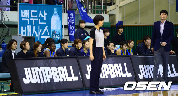 2일 오후 춘천호반체육관에서 열린 '우리은행 2013-2014 여자프로농구' 춘천 우리은행과 안산 신한은행의 경기 3쿼터 신한은행 임달식 감독이 퇴장 당한 가운데, 신한은행 선수들이 경기를 지켜보고 있다.