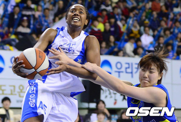 2일 오후 춘천호반체육관에서 열린 '우리은행 2013-2014 여자프로농구' 춘천 우리은행과 안산 신한은행의 경기 4쿼터 퀸이 박혜미에 슛을 저지당하고 있다.