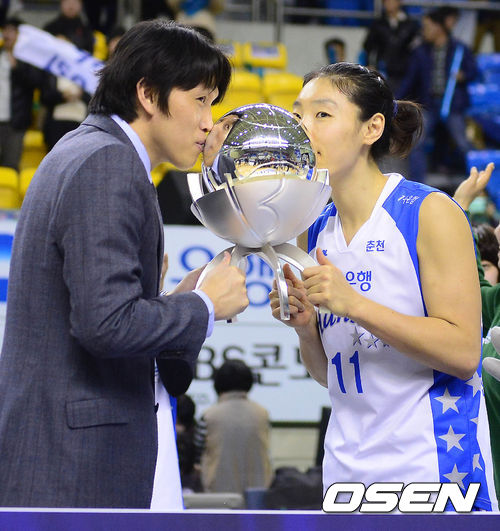 2일 오후 춘천호반체육관에서 열린 '우리은행 2013-2014 여자프로농구' 춘천 우리은행과 안산 신한은행의 경기 종료 후 위성우 감독과 임영희가 우승 트로피에 키스를 하고 있다.