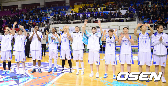 2일 오후 춘천호반체육관에서 열린 '우리은행 2013-2014 여자프로농구' 춘천 우리은행과 안산 신한은행의 경기 종료 후 우리은행 선수들이 팬들에게 손을 흔들고 있다.