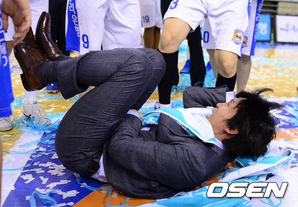 2일 오후 춘천호반체육관에서 열린 '우리은행 2013-2014 여자프로농구' 춘천 우리은행과 안산 신한은행의 경기 종료 후 우리은행 위성우 감독이 선수들에게 우승 기념 구타를 당하고 있다.