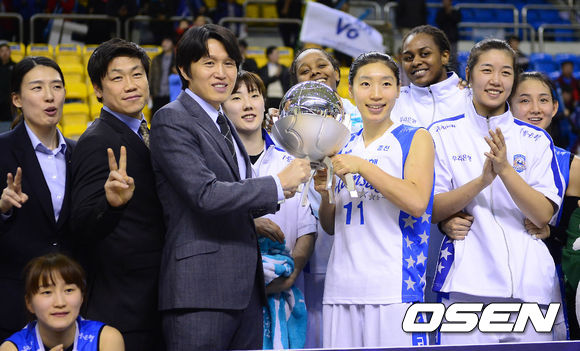 2일 오후 춘천호반체육관에서 열린 '우리은행 2013-2014 여자프로농구' 춘천 우리은행과 안산 신한은행의 경기 종료 후 우리은행 위성우 감독과 임영희가 우승 트로피를 들고 동료들과 기념촬영을 갖고 있다.