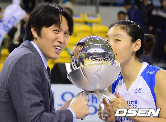 2일 오후 춘천호반체육관에서 열린 '우리은행 2013-2014 여자프로농구' 춘천 우리은행과 안산 신한은행의 경기 종료 후 위성우 감독과 임영희가 우승 트로피에 키스를 하고 있다.