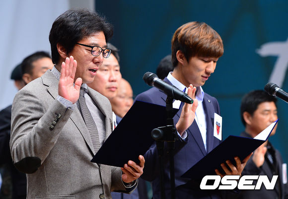 포항 황선홍 감독과 고무열이 대표로 축구 헌장 선서를 낭독하고 있다.
