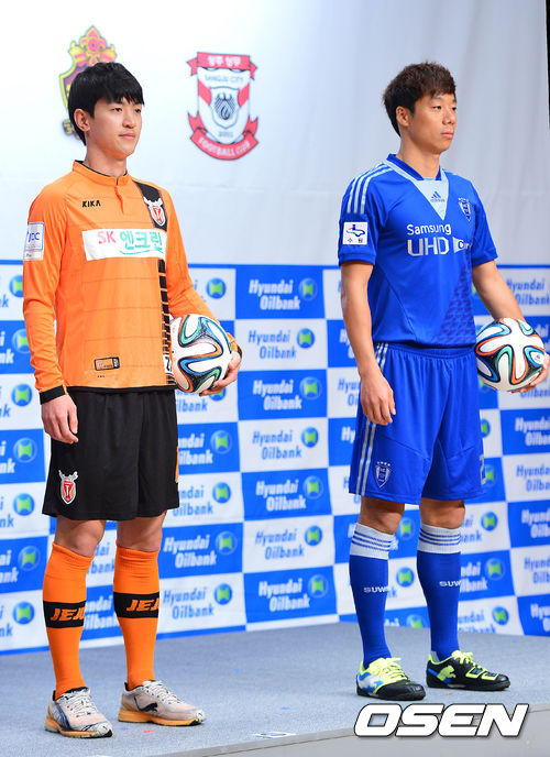 제주 송진형과 수원 염기훈이 유니폼을 입고 포토타임을 갖고 있다.