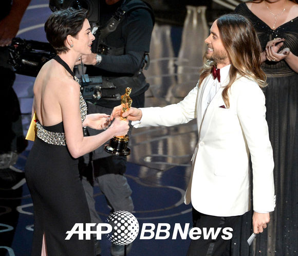 [OSEN=사진팀] 2일(현지시간 ) 미국 캘리포니아주 로스앤젤레스 돌비 씨어터에서 열린 제86회 아카데미시상식에서 배우 앤 해서웨이가 남자조연상을 수상한 자레드 레토에게 트로피를 전달하고 있다.