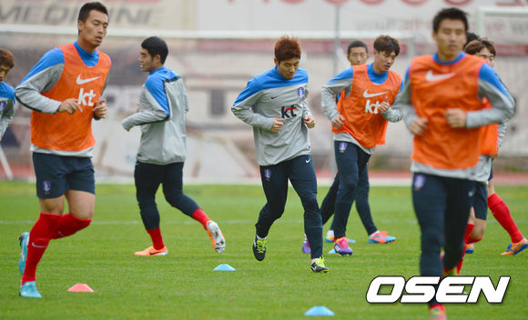 홍명보 감독의 지도아래 현지 회복 훈련 중인 지성용, 김보경 선수를 제외한 축구대표 선수들이 비가 오는 가운데 훈련에 임하고 있다./ ajyoung@osen.co.kr