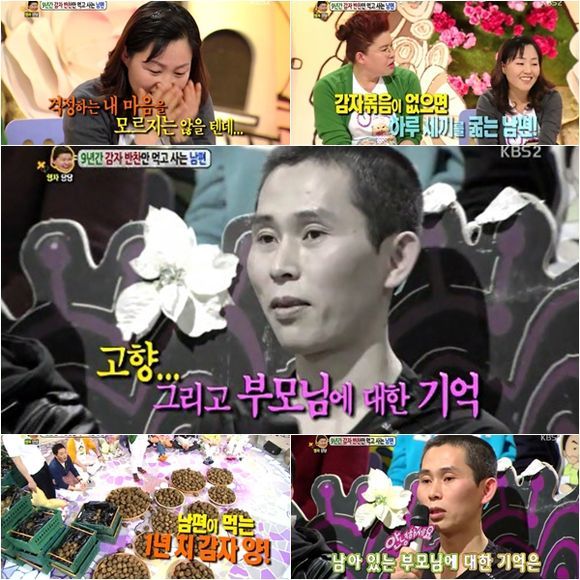 감자에 중독된 새터민의 이야기가 KBS 2TV '대국민 토크쇼 안녕하세요'를 통해 공개됐다. 북한에서 마음껏 먹지 못했던 한과, 어머니와 고향을 향한 그리움이 그를 ‘감자 중독남’으로 만들었다.