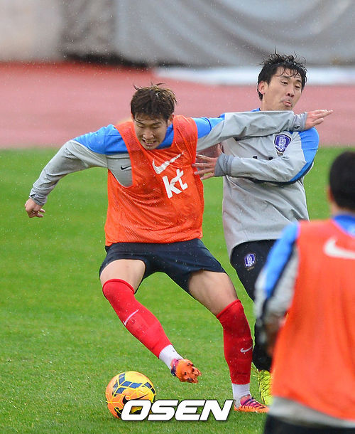 홍명보 감독의 지도아래 현지 회복 훈련 중인 지성용, 김보경 선수를 제외한 축구대표 선수들이 비가 오는 가운데 미니게임 훈련에서 손흥민이 경기에 열중하고 있다./ ajyoung@osen.co.kr