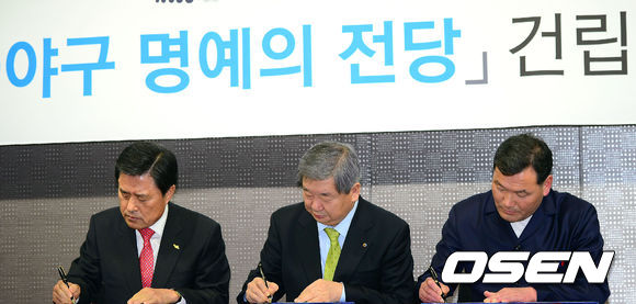 허남식 부산시장, KBO 구본능 총재, 오규석 기장군수가 협약서에 사인을 하고 있다.
