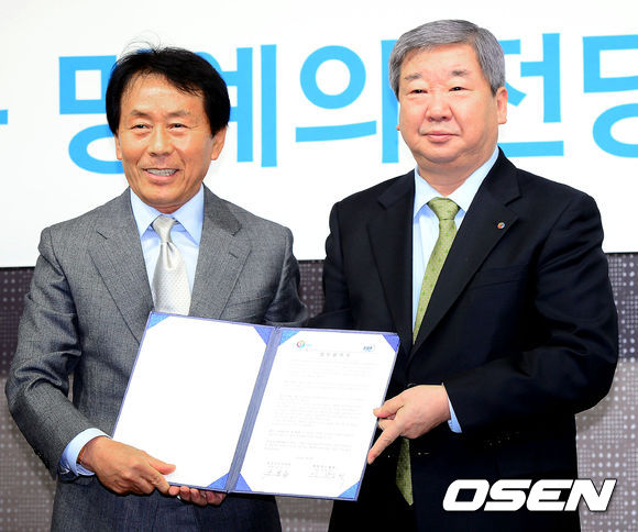 KBA 김종업 부회장과 KBO 구본능 총재가 협약서를 들고 포토타임을 갖고 있다.