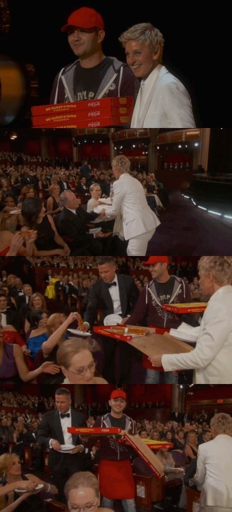 피자가 객석에 등장하자 자리에 앉아있던 브래트 피트는 벌떡 일어나 접시에 담은 피자를 다른 배우들에게 서빙했다. 메릴 스트립을 비롯한 많은 배우들이 피자 한 조각씩을 받아 들고 농담같은 해프닝에 미소를 지었다.