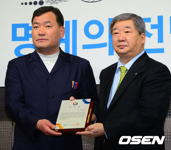 KBO 구본능 총재가 오규석 기장군수에게 감사패를 전달하고 있다.