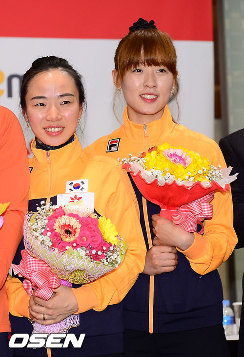 3일 오후 서울시 중구 웨스틴 조선호텔 오키드룸에서 열린 빙상 소치 동계올림픽 여자 컬링대표팀 포상식에서 김지선 김은지가 포토타임을 갖고 있다.
