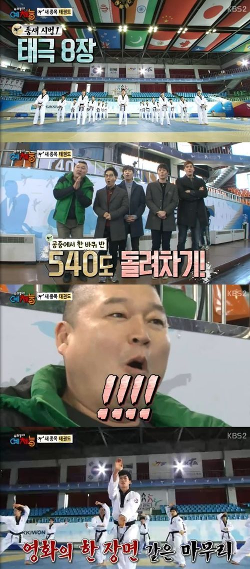 4일 방송된 KBS 2TV 예능프로그램 '우리동네 예체능'에서는 새 종목 태권도에 도전하는 강호동, 서지석, 존박, 줄리엔강, 김연우, 인피니트 호야, 2PM 찬성, 빅스타 필독 등의 모습이 그려졌다.