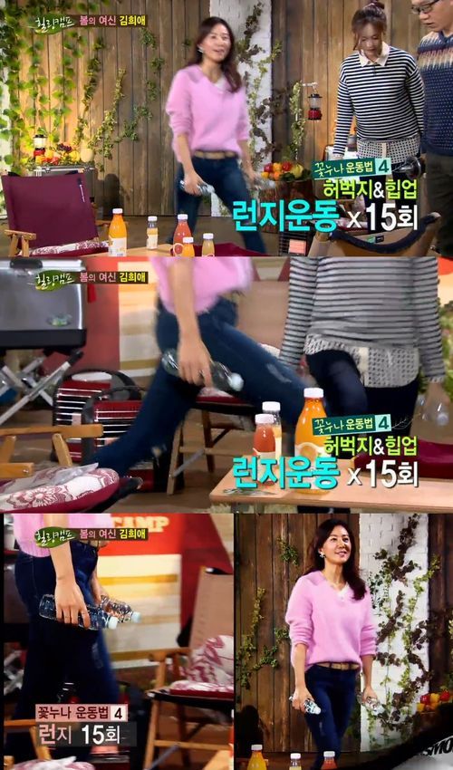 김희애는 “여자는 나이가 들면 하체가 얇아지고 힙이 쳐지면서 세월의 흔적이 보인다. 그럴 때마다 스쿼드와 런지 운동법으로 몸매를 가꾼다”고 전했다.
