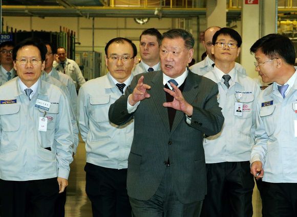 현대차그룹 정몽구 회장이 슬로바키아 질리나에 위치한 기아차 현지공장의 생산현장을 방문하고, 유럽 전역에 공급되는 현지전략차종의 생산 품질을 임직원들과 함께 점검하고 있다. /현대차 제공.