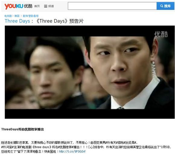 ‘쓰리데이즈’의 판권을 구매한 곳은 중국 최대 동영상 사이트 유쿠(youku)다. 중국 내에서 가장 많은 가입자와 접속자 수를 자랑하는 곳인 만큼 ‘쓰리데이즈’가 시작되면 중국 내 또 한번 강력한 한류가 휘몰아칠 전망이다.