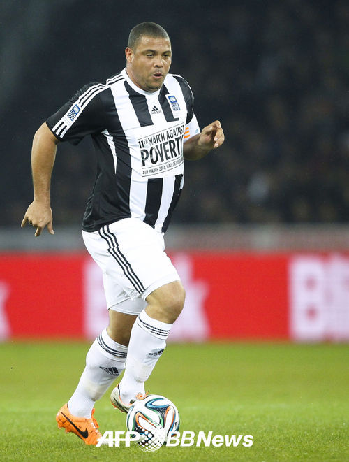 [사진=AFP 특약]브라질 전 축구선수 호나우두가 3일(현지시간) 스위스 베른에서 열린 빈곤 퇴치 자선 축구 경기(주최 유엔 개발 프로그램 UNDP)에서 드리블을 보이고 있다.