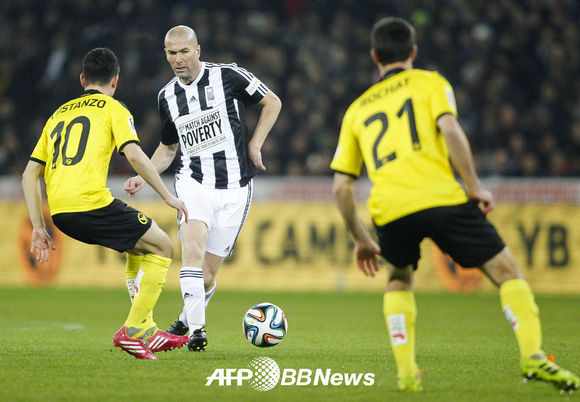 [사진=AFP 특약]프랑스 전 축구선수 지단이 3일(현지시간) 스위스 베른에서 열린 빈곤 퇴치 자선 축구 경기(주최 유엔 개발 프로그램 UNDP)에서 드리블을 보이고 있다.