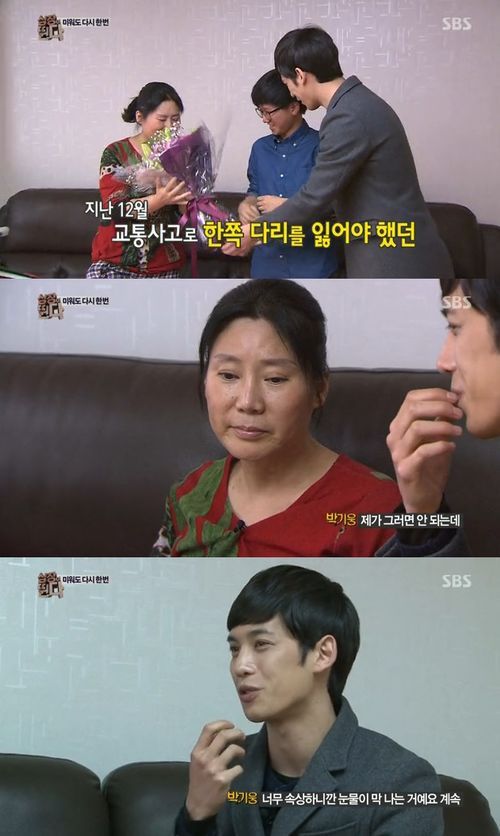 그러나 박기웅의 가슴을 더욱 아프게 하는 사실이 있었다. 이종순 씨는 박기웅이 자신의 다리를 토닥여 주자 “우리 아들이 만져주는 것 같아서 좋다”고 말했다. 알고 보니 이종순 씨는 지난해 교통사고로 아들을 잃었던 것. 아들을 먼저 보낸 아픔을 잊기도 전에 교통사고로 한쪽 다리를 잃었다.