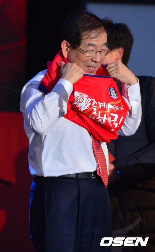 5일 오후 서울 중구 태평로 서울시청광장에서 열리 월드컵 D-100 대한민국 응원출정식에서 박원순 서울시장이 붉은악마 응원티셔츠를 입고있다.