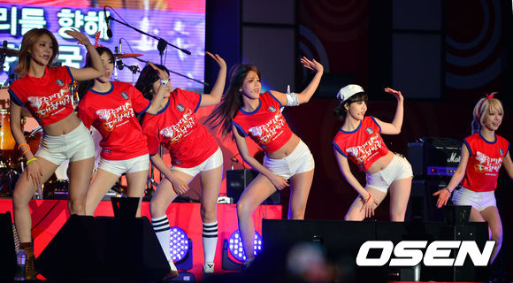 5일 오후 서울 중구 태평로 서울시청광장에서 열리 월드컵 D-100 대한민국 응원출정식에서 걸그룹 AOA가 축하공연을 펼치고 있다.