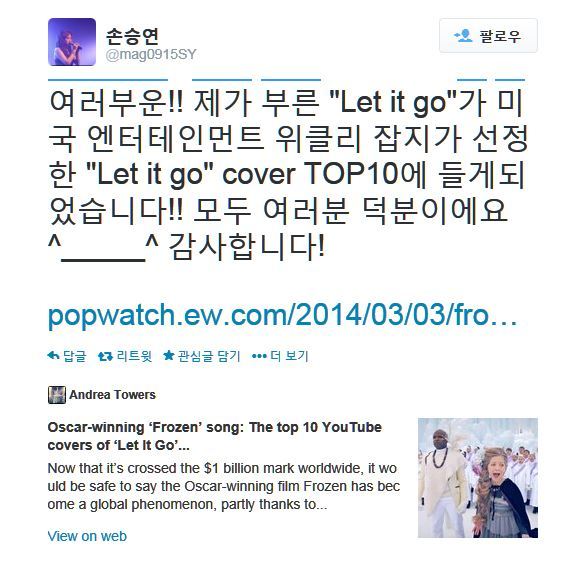 손승연은 5일 자신의 트위터에 “여러분 제가 부른 ‘Let it go’가 미국 엔터테인먼트 위클리 잡지가 선정한 ‘Let it go’ cover TOP10에 들었습니다. 모두 여러분 덕분이에요. 감사합니다”라는 소감을 게재하며 팬들과 기쁨을 나눴다.