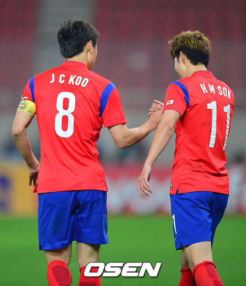 후반 한국 손흥민이 두번째 골을 작렬시킨 뒤 구자철과 인사를 나누고 있다.