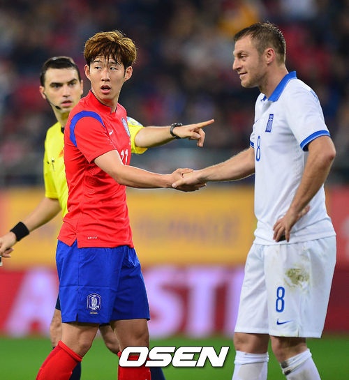 전반 한국 손흥민이 그리스 소크라티스 파파스타토포울로스(도르트문트)와 인사를 나누고 있다.