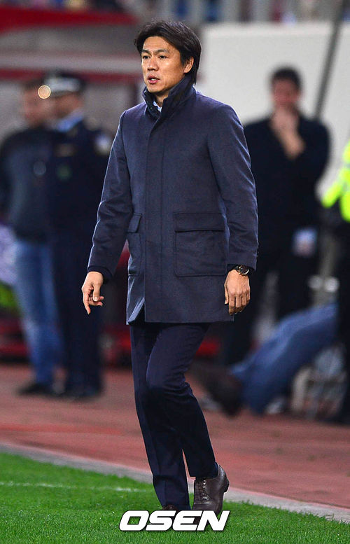 후반 한국 홍명보 감독이 선수들에게 지시를 내리고 있다.