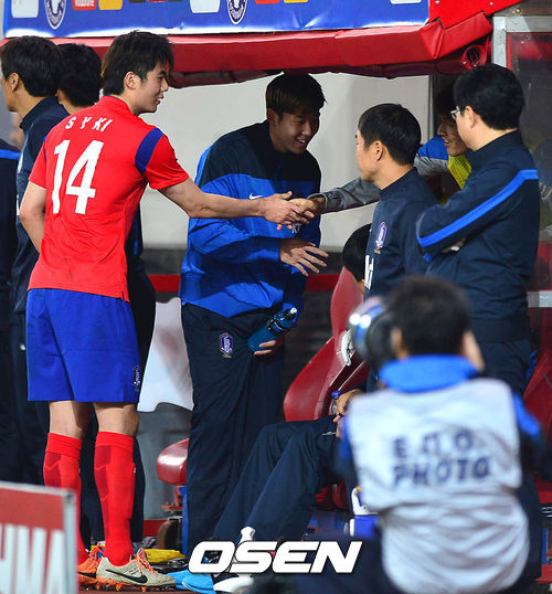 후반 한국 기성용이 교체된 뒤 손흥민, 박종우와 인사를 나누고 있다.