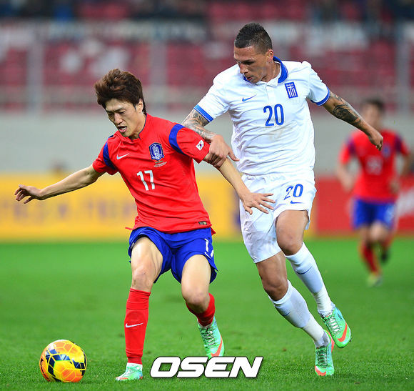 전반 한국 이청용이 그리스 코세 콜레바스와 몸싸움을 벌이며 드리블 돌파를 시도하고 있다./ ajyoung@osen.co.kr