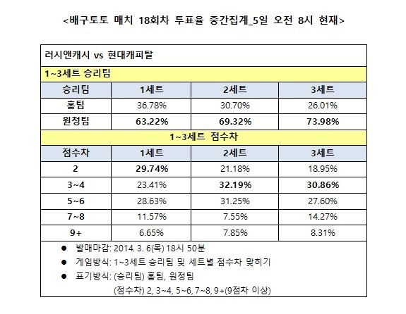 국민체육진흥공단(www.kspo.or.kr)이 발행하는 체육진흥투표권 수탁사업자인 스포츠토토의 공식 온라인 발매사이트 베트맨(www.betman.co.kr)은 오는 6일(목) 열리는 2013-2014시즌 V-리그 러시앤캐시-현대캐피탈전을 대상으로 하는 배구토토 매치 18회차 게임 투표율 중간집계 결과, 배구팬들은 현대캐피탈이 러시앤캐시를 상대로 우세한 경기를 펼칠 것으로 예상했다.