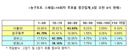 투표율을 살펴보면, SK는 80~89점대가 43.83%로 가장 많이 집계됐고, 원정팀 동부의 경우 69점 이하가 45.79%로 1순위를 기록했다.
