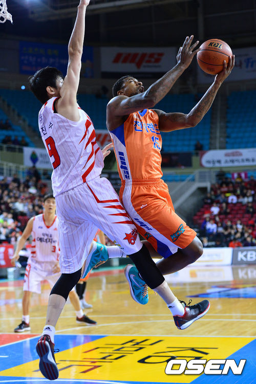 1쿼터, 전자랜드 포웰이 오리온스 김진수의 수비를 피해 슛을 시도하고 있다.