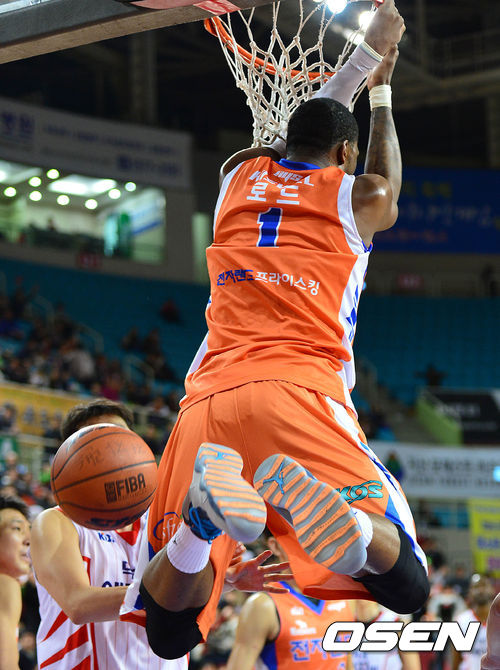 2쿼터, 전자랜드 로드가 리바운드를 잡아 그대로 덩크슛을 시도해 성공시키고 있다.