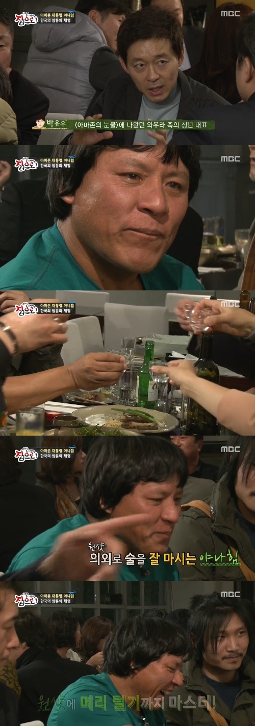 이후 박용우에게 소주를 받은 야나힘. 그는 흔쾌히 잔을 받은 뒤 ‘친친’를 외치며 소주를 원샷했다. 특히 머리털기까지 마스터해 주위를 웃음바다로 만들었다.