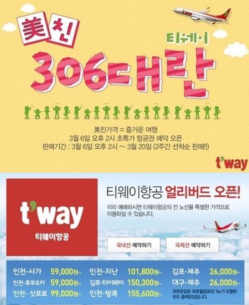 티웨이항공은 5일 공식 페이스북에 ‘티웨이 미친 306대란 특가 이벤트’라는 공지를 내걸었다. 지난 6일 2시부터 20일까지 진행되는 이번 행사는 티웨이항공 국내선과 국제선 일부 노선에 대해 파격적인 운임의 항공권을 내놓았다.