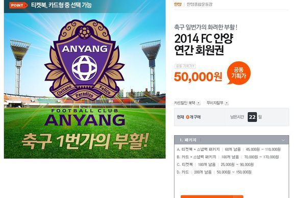 FC안양은 지난 6일부터 티켓몬스터(www.ticketmonster.co.kr)를 통해 2014연간회원권과 FC안양 공식 상품인 스냅백 모자를 합리적인 가격에 구매할 수 있는 패키지 상품을 출시했다.