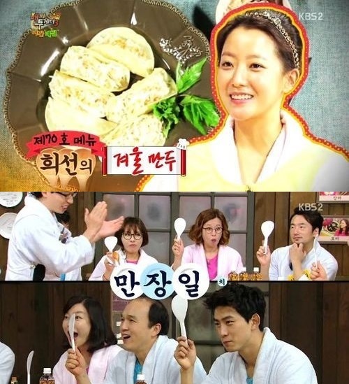 이날 '해피투게더3'에는 주말드라마 '참 좋은 시절' 배우인 김희선, 최화정, 김광규, 류승수, 택연이 출연해 입담을 뽐냈다. 김희선은 야식 메뉴 '겨울 만두'를 선보여 제70호 야간 메뉴에 만장일치로 이름을 올렸다.