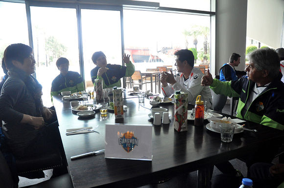 지난달 11일부터 터키 안탈리아에 동계훈련 베이스캠프를 차린 강원FC. 어느새 전지훈련도 3주차에 접어들었지만 선수단 전체에는 에너지가 넘친다. 힘든 훈련을 마치고 식당에 모여 매끼 식사를 할 때마다 수다꽃이 핀다. 그중 가장 시끄러운 곳이 있으니, 바로 코칭스태프가 모여 앉은 테이블이다.