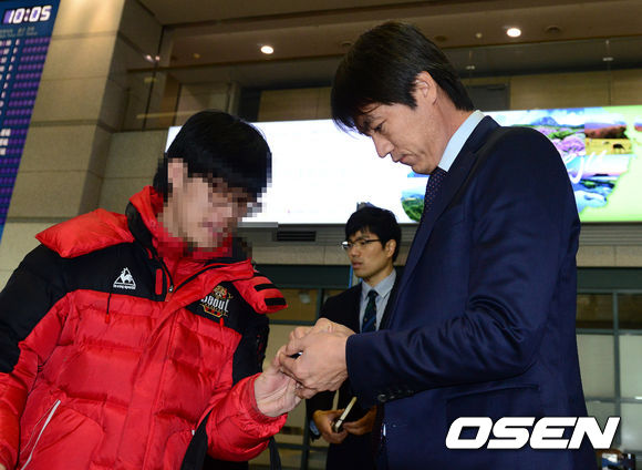 홍명보 감독이 인터뷰를 마치고 팬의 사인 요청에 응하고 있다.