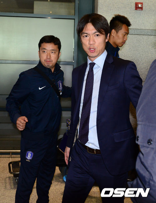 홍명보 감독이 인터뷰를 마치며 입국장을 나서고 있다.