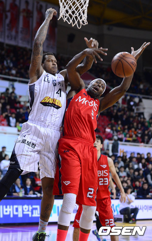 7일 오후 울산 동천체육관에서 열린 '2013-2014 KB국민카드 프로농구' 울산 모비스와 창원 LG의 경기 1쿼터 제퍼슨과 벤슨이 리바운드 다툼을 하고 있다.